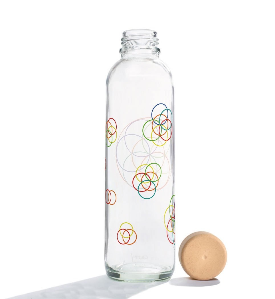 Hippe, glazen waterfles met kleurrijk design van het merk Carry Bottles uit Berlijn.