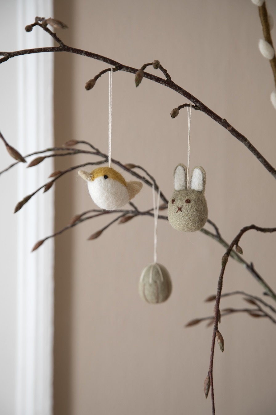Deze leuke haasjes in natuurlijke klei tinten staan heel sfeervol in een paar paastakken, de vilten hangertjes zijn ontworpen in Denemarken door Én Gry & Sif (Fair Trade-gecertificeerd bedrijf) en 100% handgemaakt in Nepal door zeer bekwame Nepalese vrouwen.