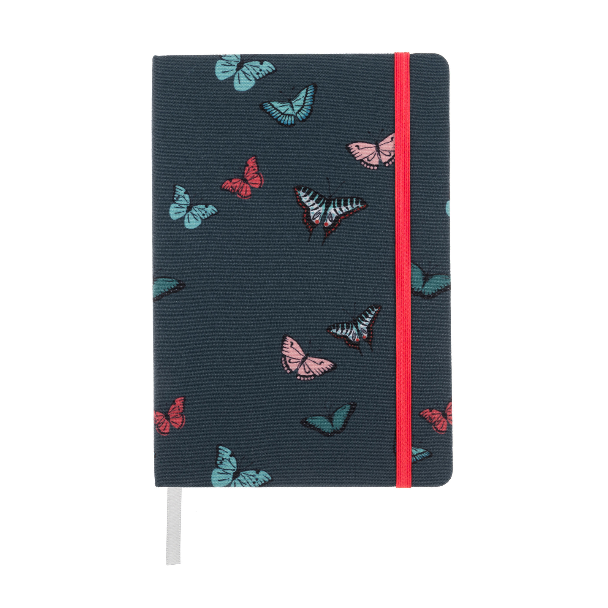 Dit stijlvolle A5 notitieboekje heeft heel veel kleurrijke vlinders op een stoffen blauwe achtergrond en is het perfecte cadeau voor iedereen die gek is op vlinders! Dit mooie notitieblok heeft 140 pagina's (70 vellen) gelinieerd ivoorkleurig papier, een elastieken sluiting en een praktische lintje voor de paginamarkering. Perfect om in je handtas te bewaren als je belangrijke aantekeningen moet maken of een boodschappenlijstje moet schrijven. Het notitieboekje komt uit de Vlinder collectie van het Engelse lifestyle merk Sophie Allport.
