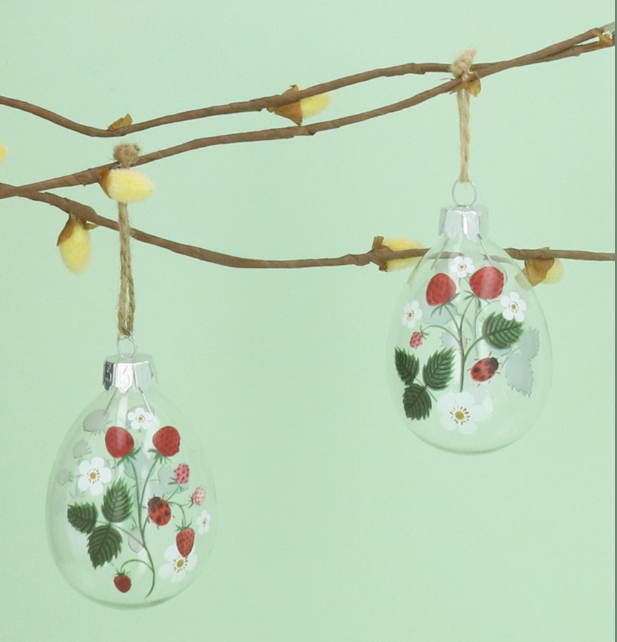 Twee prachtige paasei hangertjes met Aardbeitjes design van het Britse lifestylemerk Gisela Graham London. De paaseitjes zijn gemaakt van transparant glas en staan prachtig in bijvoorbeeld paastakken, op het ene hangertje staat een lieveheersbeestje en op de andere een paashaasje tussen de aardbeiplantjes.