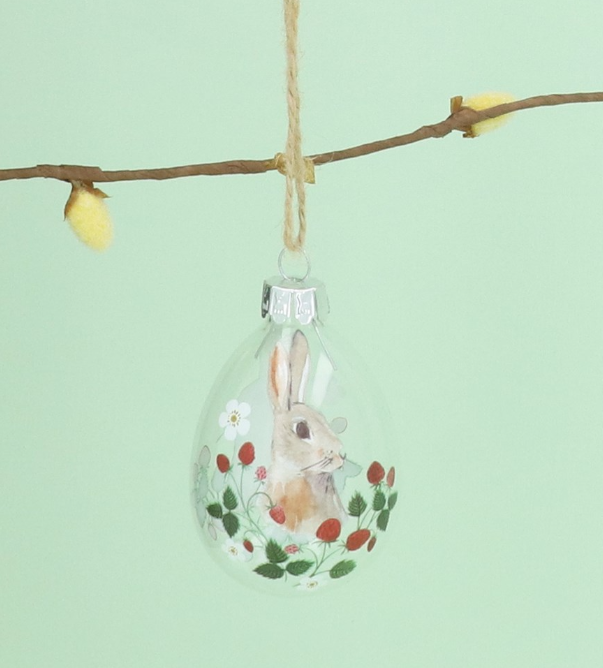 Gisela Graham London transparante paasei hangertjes van glas met Aardbei design met haasje en lieveheersbeestje - set van 2