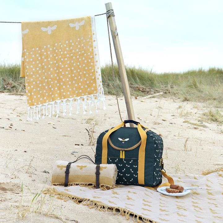 Dit heerlijk zachte picknickkleed, is een must-have voor strandgangers en picknickliefhebbers. Het is ideaal voor dagjes uit met de familie of om gewoon een lekker dutje op te doen in de zon. Het mooie picknickkleed in citroengele kleur, heeft een leuk patroon met bijtjes. Het picknickkleed heeft een waterbestendige achterkant en is handig om overal mee naar toe te nemen, door de kunstleren bandjes met handvat. Een mooi cadeau voor alle bijenliefhebbers!