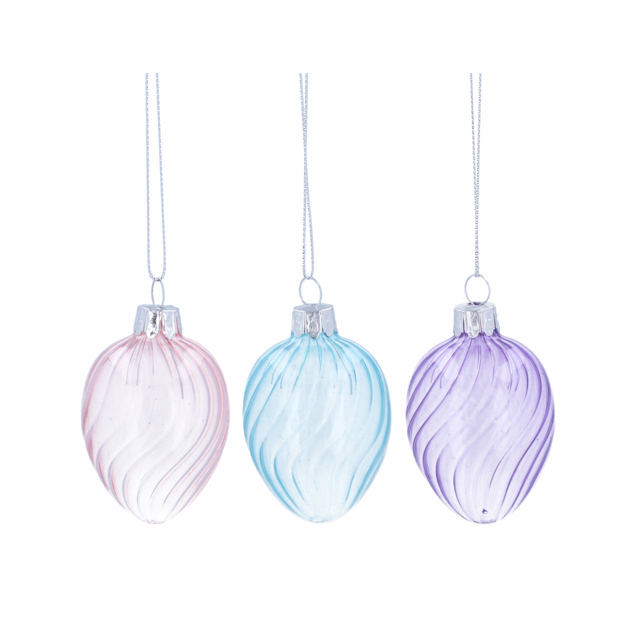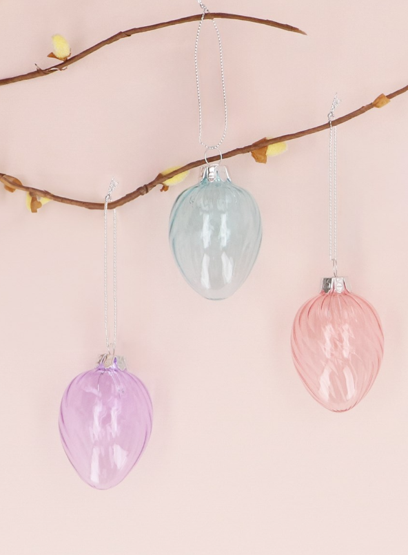 Drie stijlvolle spiraalvormige paasei hangertjes van het Britse lifestylemerk Gisela Graham London. De roze, paarse en lichtblauwe paaseitjes in zijn gemaakt van transparant gedraaid glas en staan prachtig in bijvoorbeeld paastakken.