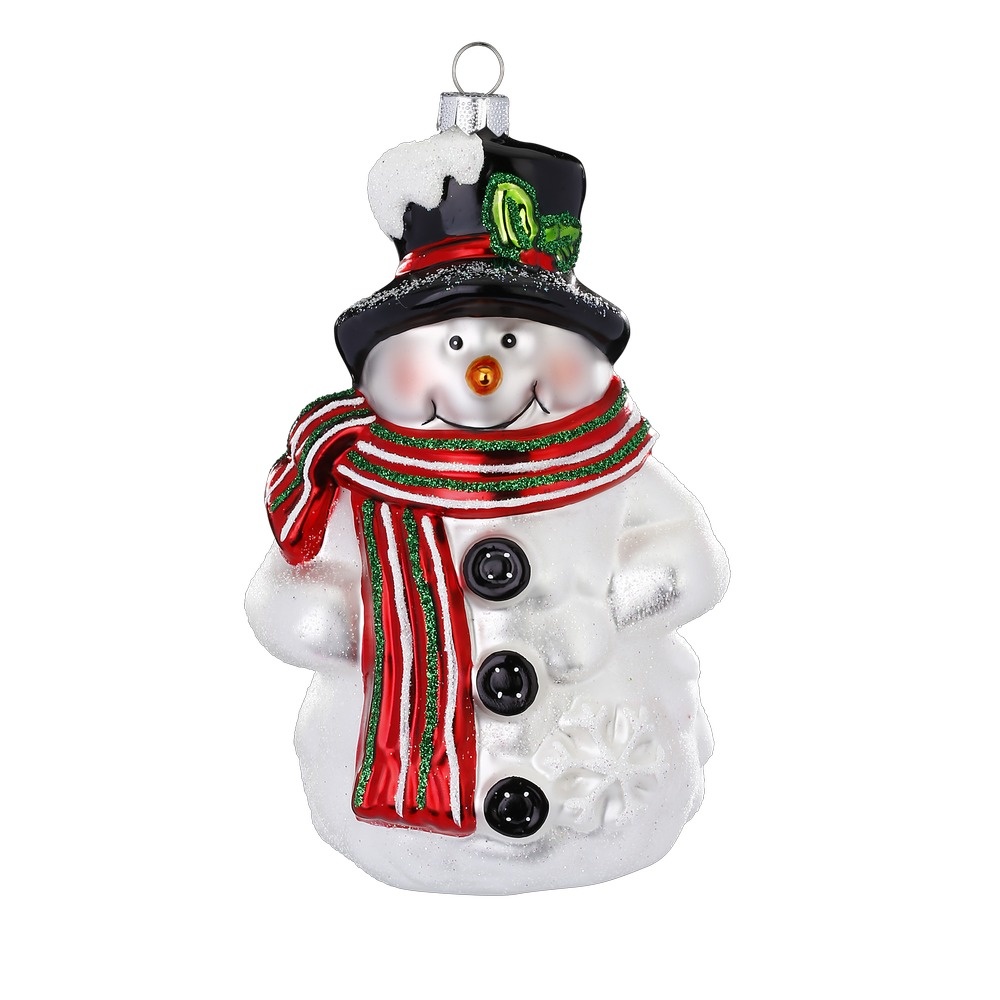 Deze sneeuwpop heeft een mooie rood, groen, wit gestreepte sjaal, zwarte hoed met restje sneeuw en mooie zwarte knoopjes op zijn sneeuwbuik. Deze vrolijke sneeuwpop kersthanger is gemaakt van glas en met de hand gedecoreerd.