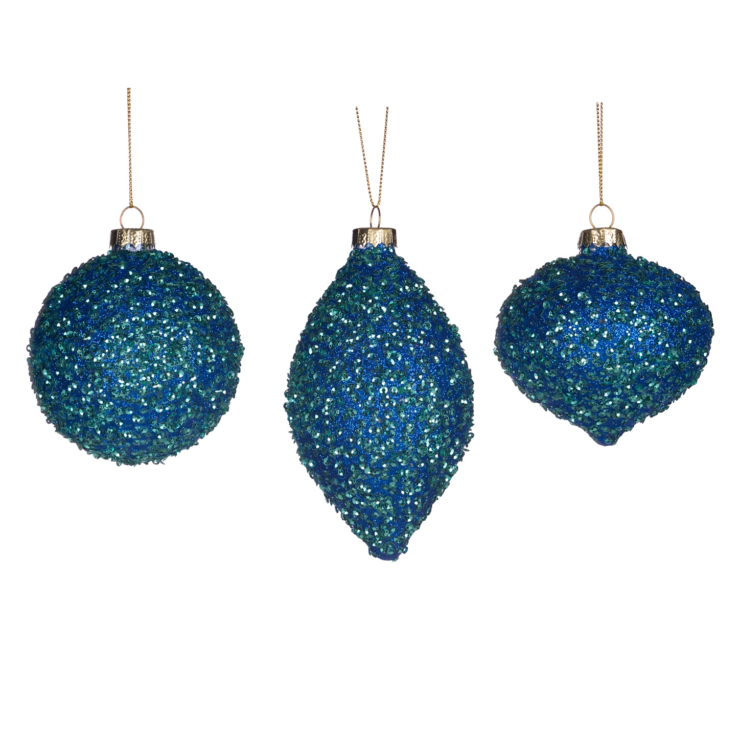 Zee blauwe Glitter Kerstballen met lichtblauwe pailletten - set van 3 verschillende vormen