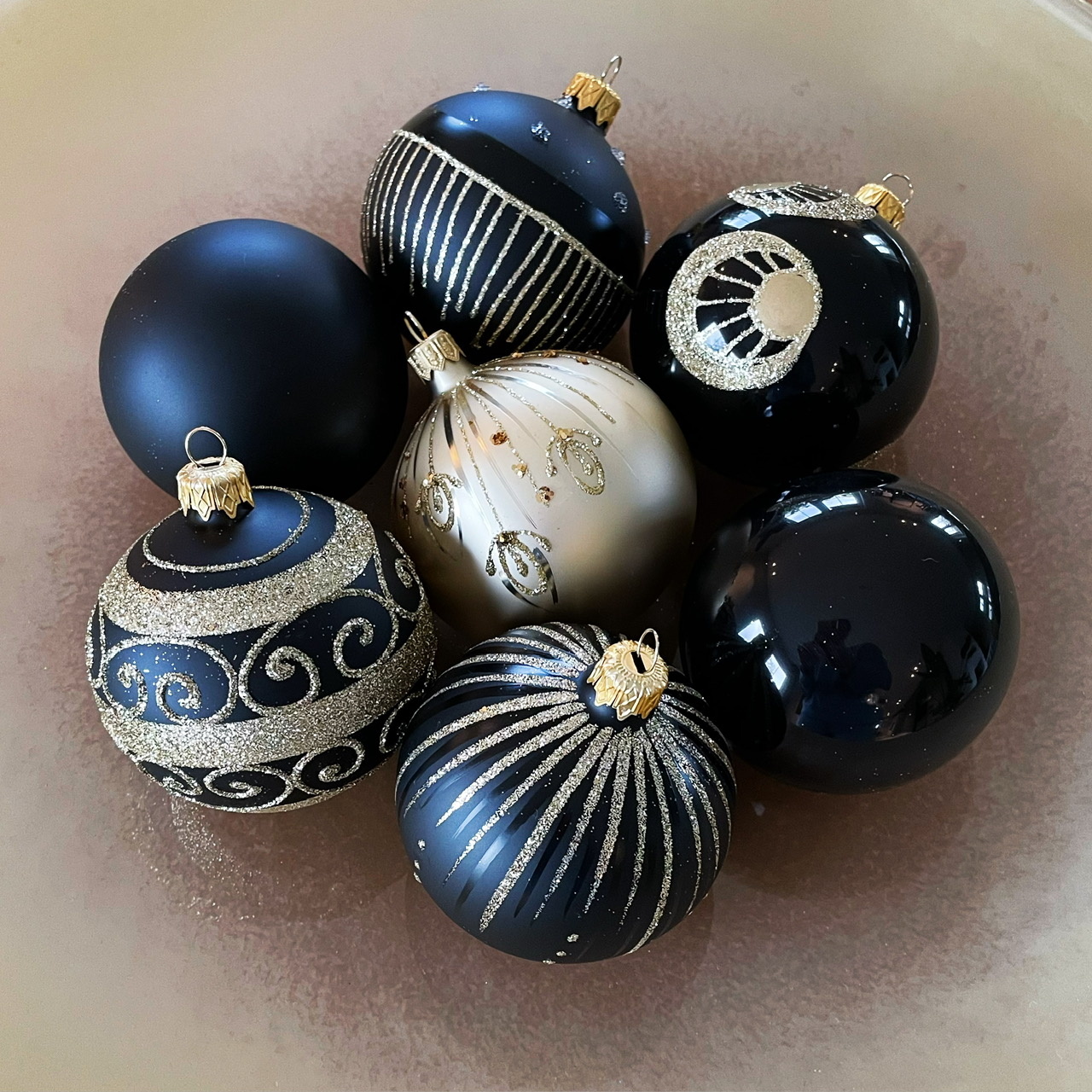 Set van 3 zwarte kerstballen van 8 cm, de kerstballen zijn mat en gedecoreerd met gouden glitter streepjes.